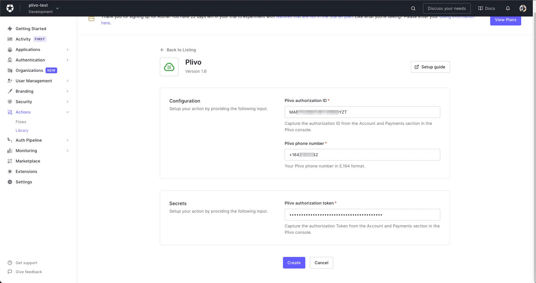 Configure the integration by filling in the fields on the next screen with your Plivo Auth ID and Auth Token and your Plivo phone number.