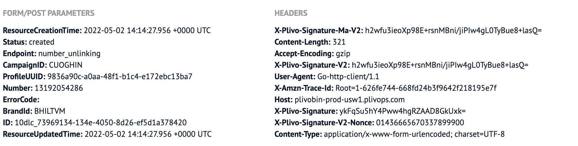 | number_unlinking | created | Request to unlink your Plivo long code with the campaign was submitted to operators. |
