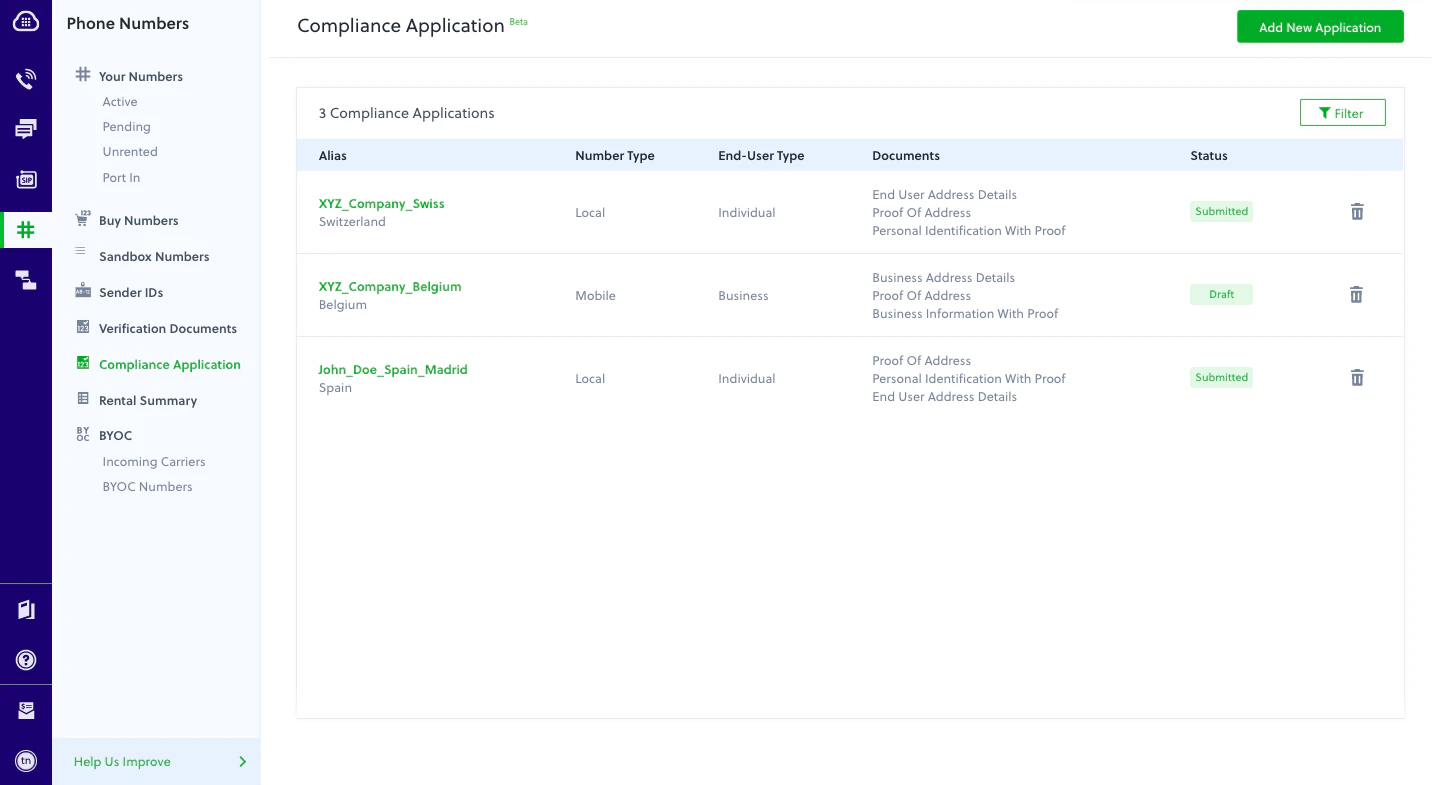 Note: An Accepted Compliance Application cannot be deleted if it’s associated with a phone number. To delete such an application, unrent the phone number from your account, then proceed with the deletion.