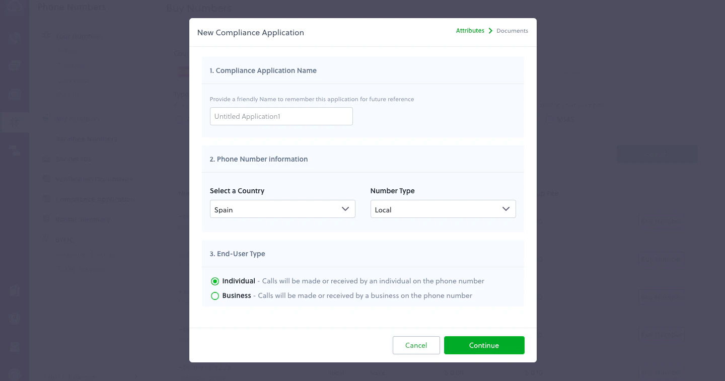 - On the next screen, provide the necessary information and supporting documents based on the compliance requirements of the phone number. You can create new documents or use any existing documents that are available from the drop-down. Once you’ve entered the necessary information, click on Submit Application. You’ll return to the phone number rental flow, where you can map the newly created Compliance Application to the phone number.