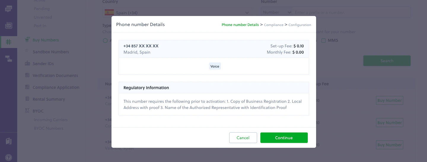 - Click on Buy Number and Continue to add the phone number to your account. At this point the phone number’s compliance status is “in-review” while Plivo reviews the number and the documentation. Phone numbers undergoing review can be viewed and configured on the Pending Numbers page. Phone numbers listed on this page are not available for use until approved.