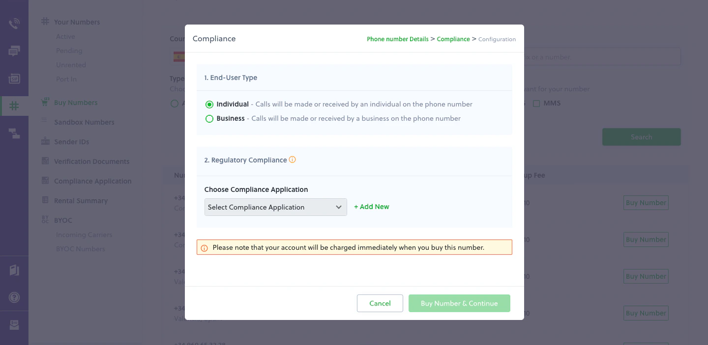 - Select the relevant end-user type, then assign a Compliance Application to the phone number. A Compliance Application is a logical grouping of documents required for ensuring compliance for a unique combination of phone number country, number type, and user type. Existing eligible Compliance Applications are listed in the drop-down. You can create a new Compliance Application by clicking on Add New.