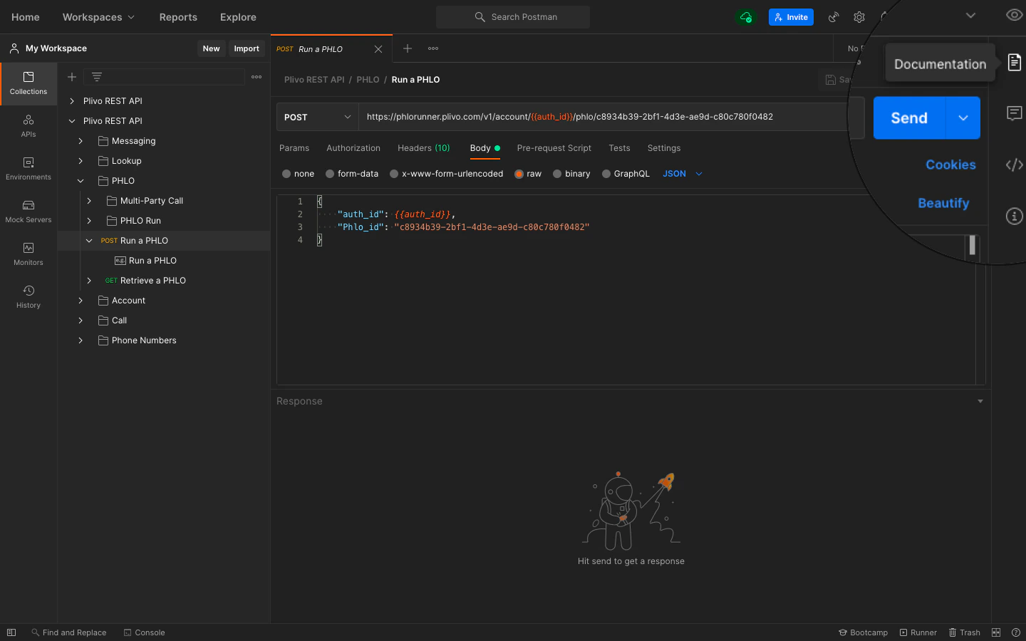 To see how Plivo and Postman work together, let’s start by running a PHLO. From the imported Plivo REST API collection, select the folder named PHLO, and select the request to Run a PHLO. Replace the value ofPhlo_id with the ID of one of the PHLOs available on the console. Phlo_id and auth_id are the only mandatory parameters.