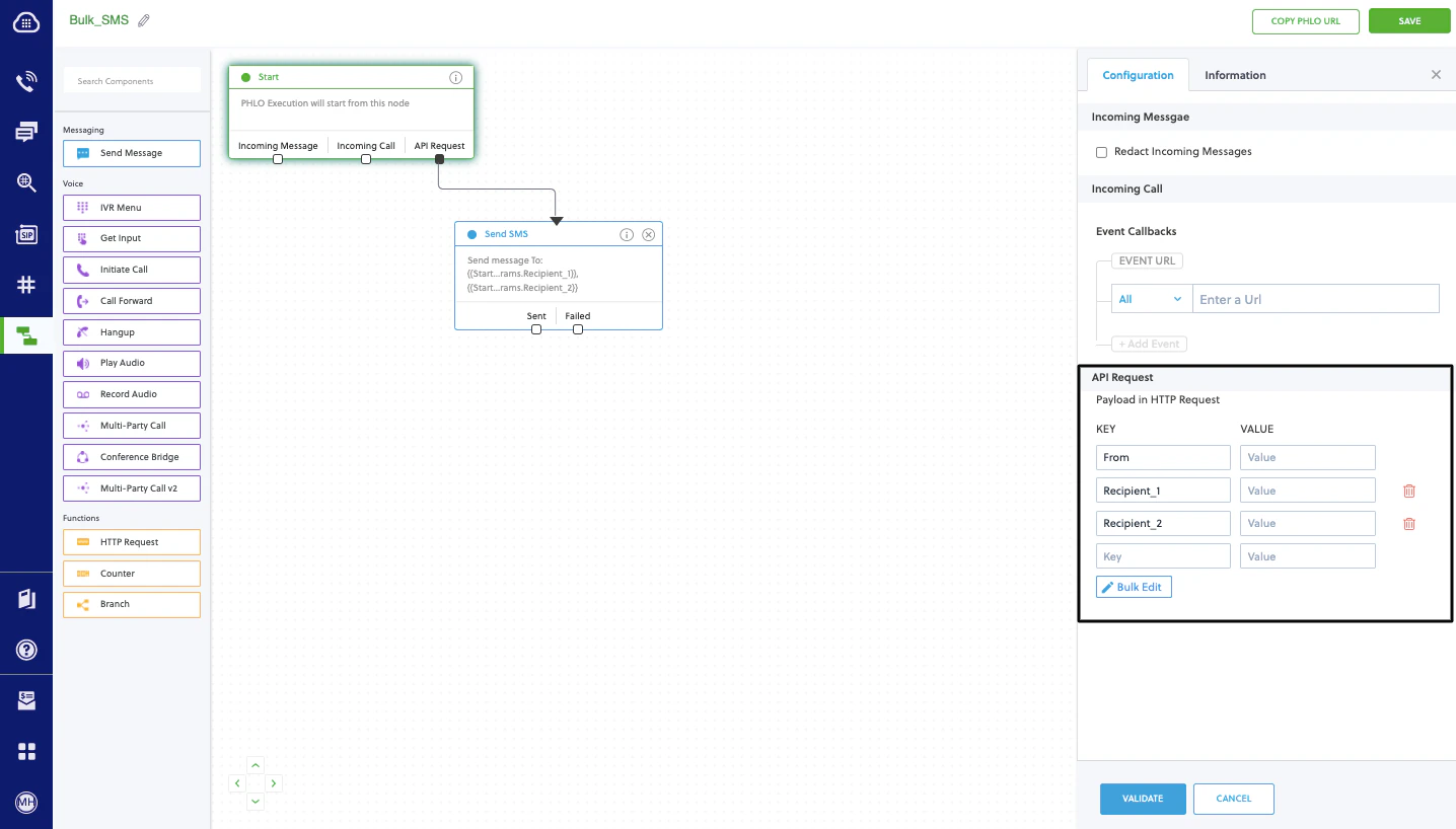 If you plan to use a dynamic payload — passing values through parameters when you trigger the PHLO from your application — click on the Start node to open the Configuration pane. Under API Request, enter key names for the variables you want use in your payload — From, To, and Message fields.