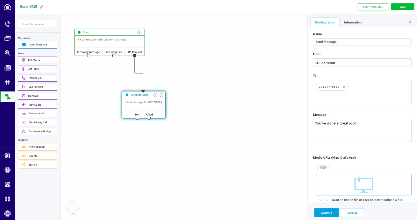 The Start node is the starting point of any PHLO. It lets you trigger a PHLO to start upon one of three actions: incoming SMS message, incoming call, or API request.