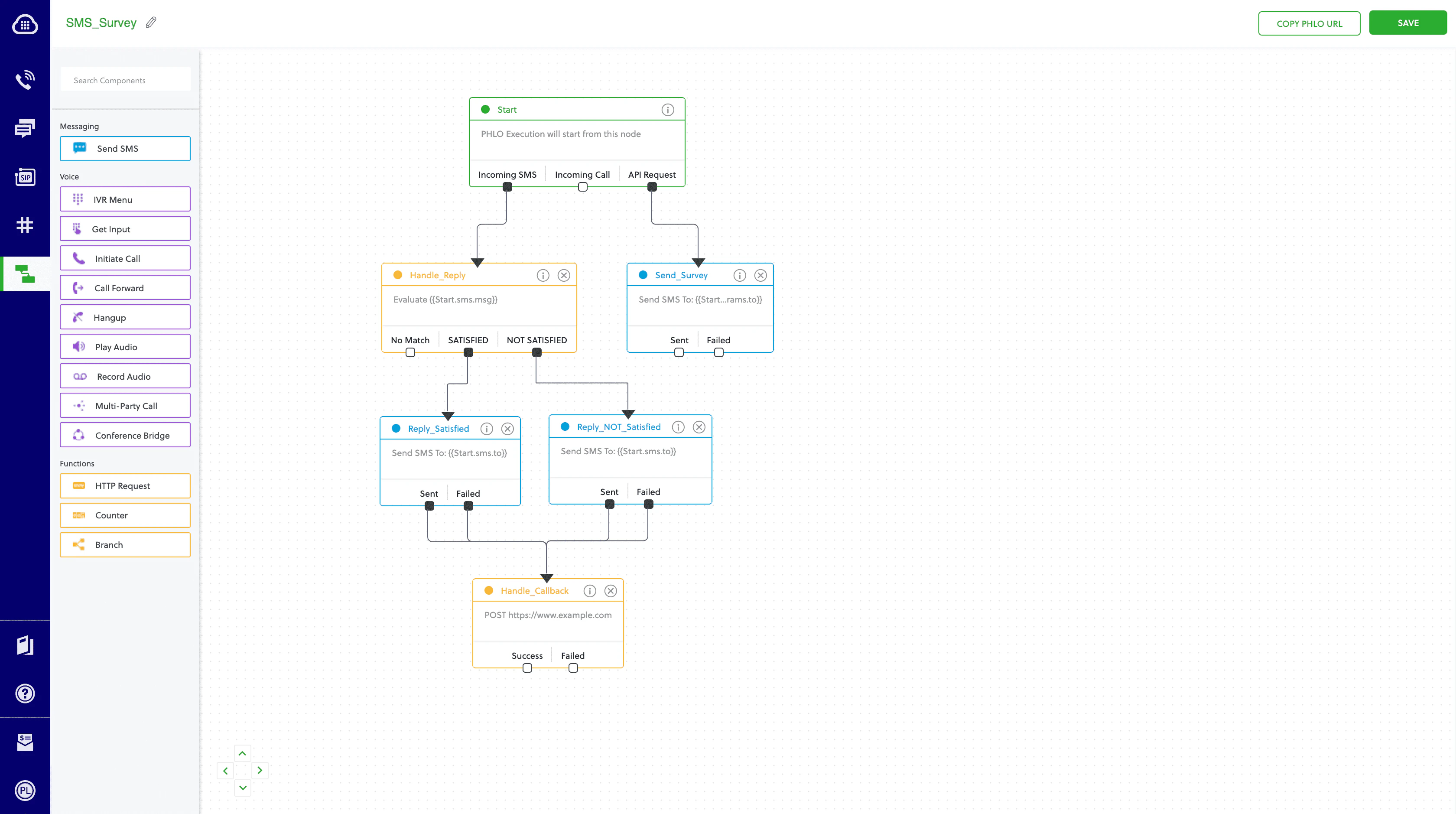 You can create and deploy a PHLO to conduct an SMS survey with a few clicks on the PHLO canvas and trigger it with a few lines of code.