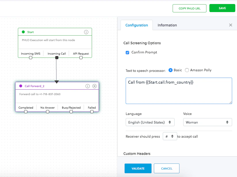 - Enter a message, select the language and voice to use, and select the confirm key from the drop-down list.