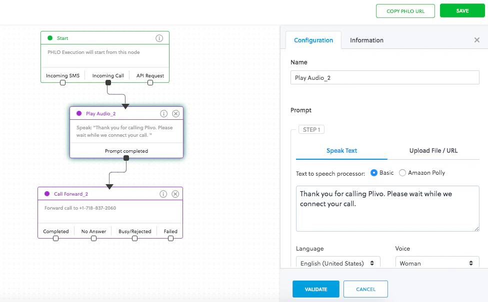 - Text to speech: Type the message you want to leave and select the language and voice you want to speak the message. Plivo will convert the typed text to voice and play it to the caller.