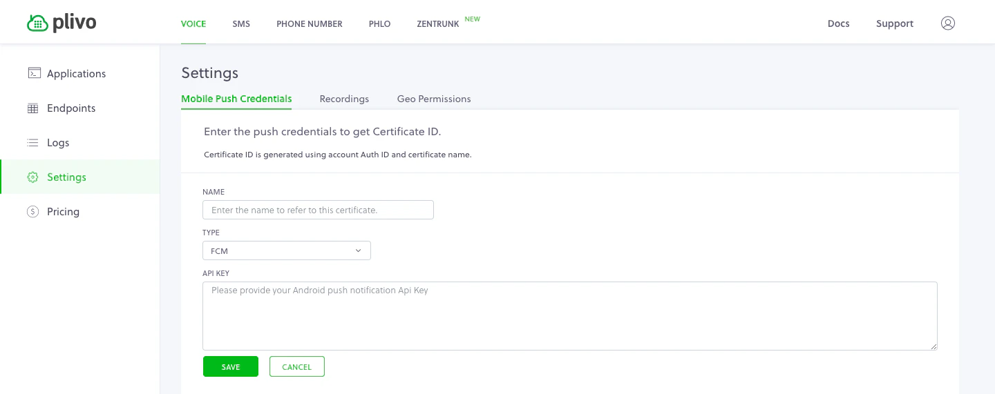 - Go to Voice > Mobile Push Credentials on the Plivo console, click on Update New Push Credential, and add the server key as type FCM.