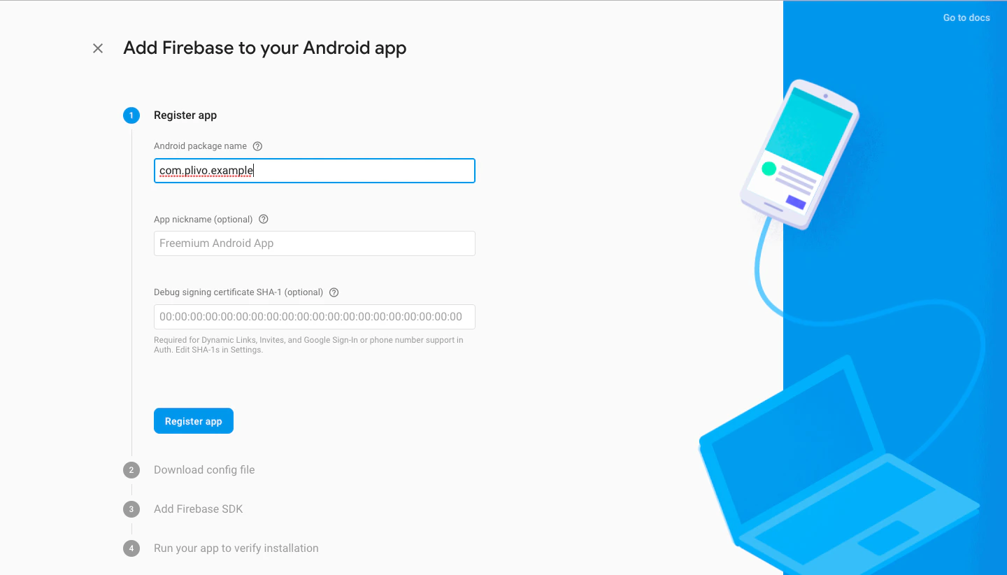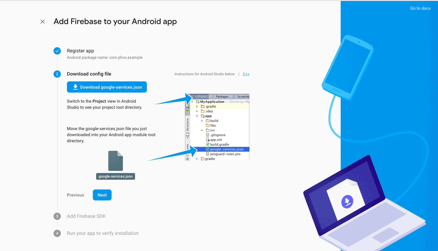 This section explains how to receive incoming calls on the Plivo Android SDK v2 using Firebase. To receive an incoming call, you must:- Create a project on Firebase.