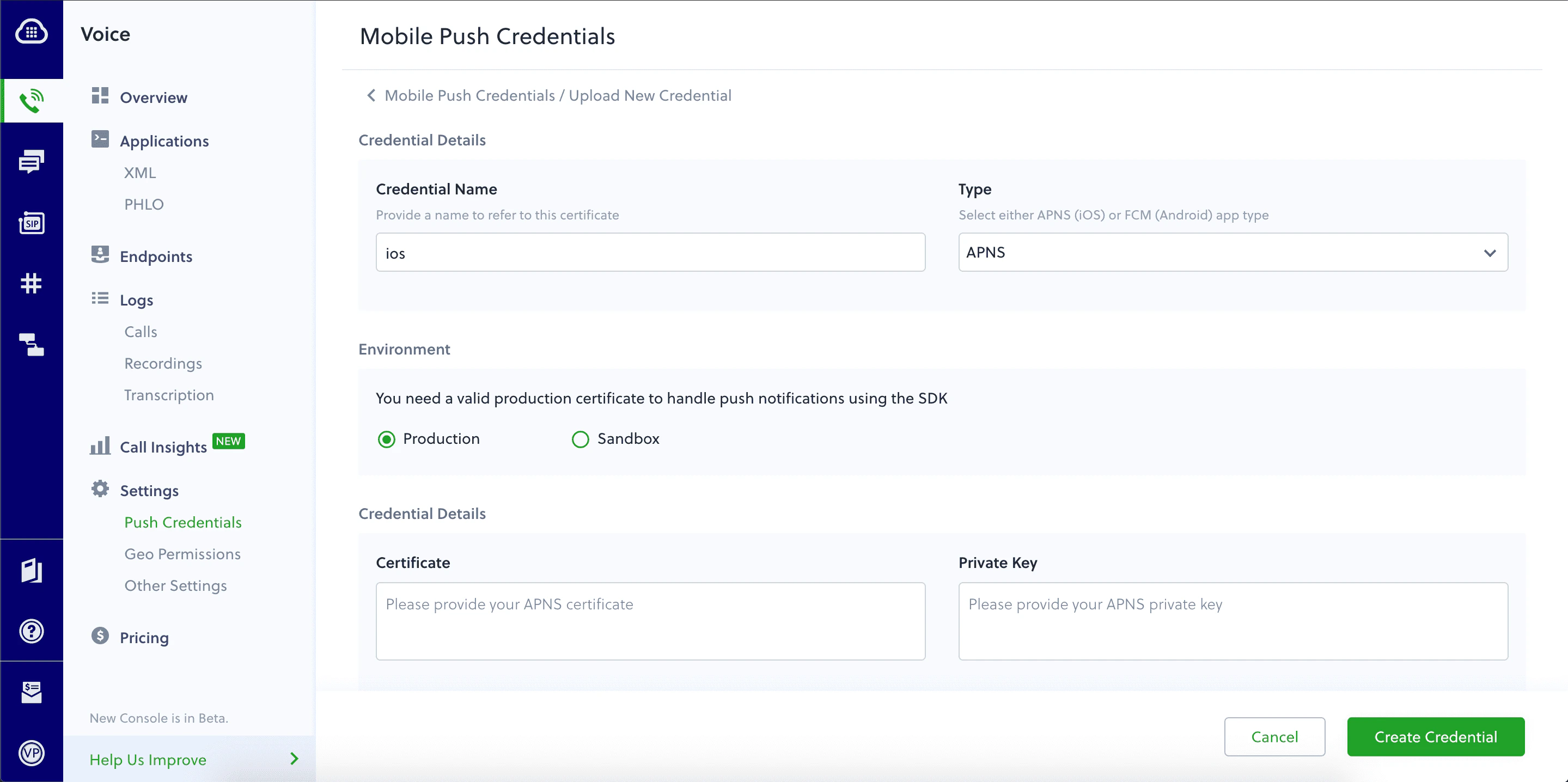 You can manage both iOS and Android push credentials in the console at Voice > Push Credentials. iOS uses the APNS certificate type and Android uses the FCM certificate type. You can upload up to 10 certificates per account on the console.Adding an iOS push credential