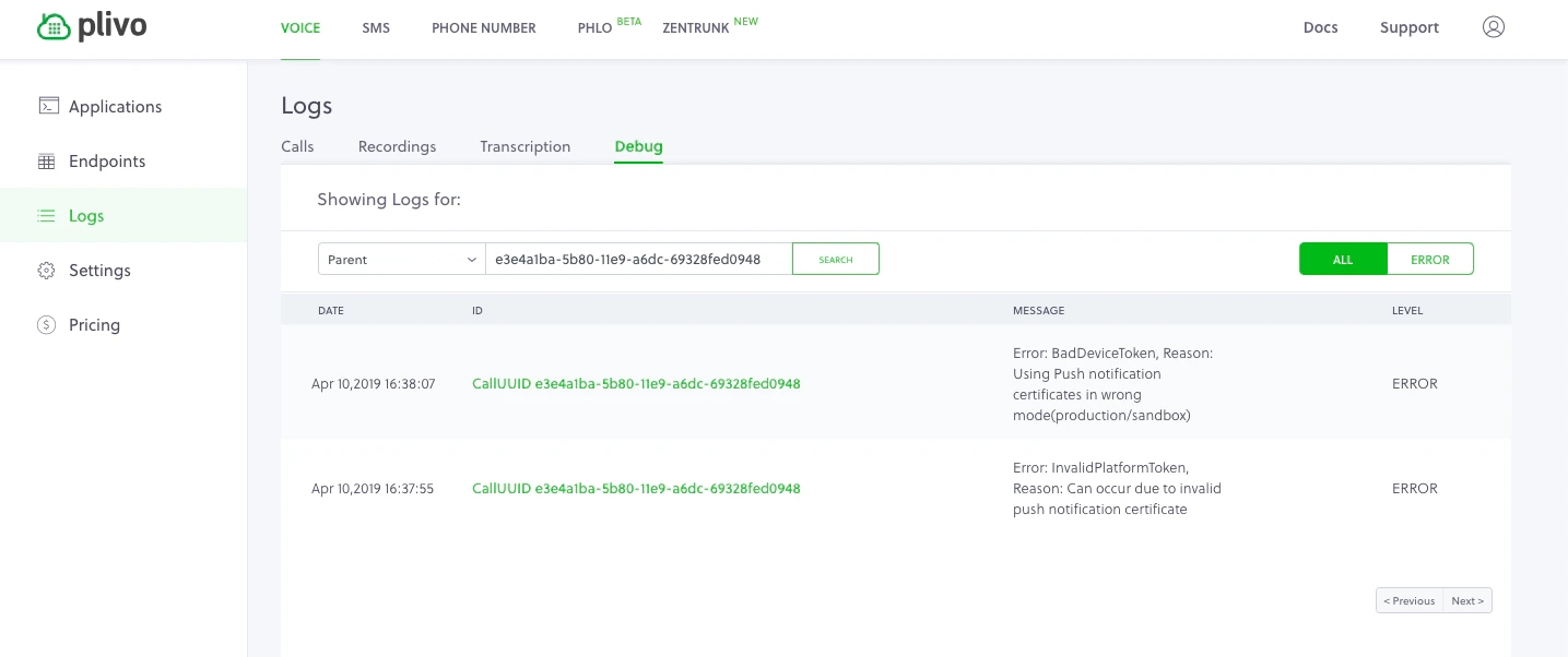 Plivo shares information regarding push notification failures in its call debug logs. Here’s a list of error messages related to push notification failures that you may come across in Plivo console logs.-