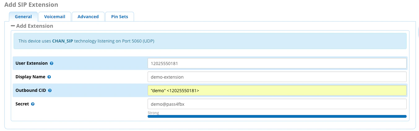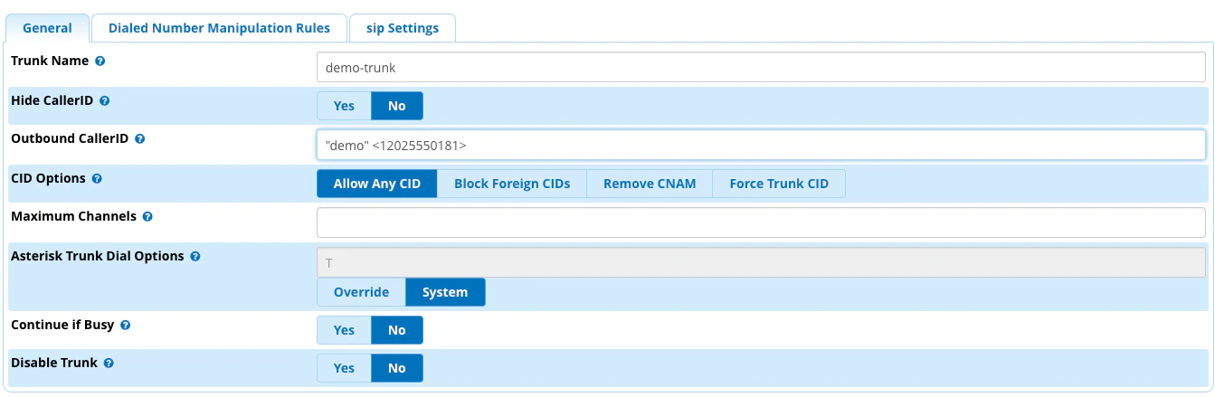 - Outbound Caller ID: Caller ID for the calls placed using this trunk. This has to be in the following SIP format: