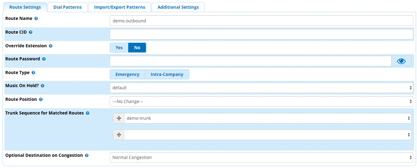 - Once you have entered your dial pattern, click Submit. The outbound route will be configured to your trunk. You must now configure an extension.