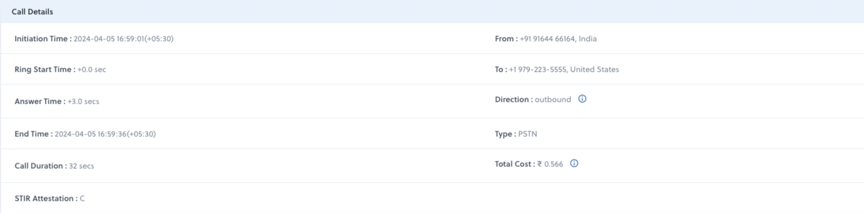- STIR Attestation: Attestation indicator (applicable for US calls).