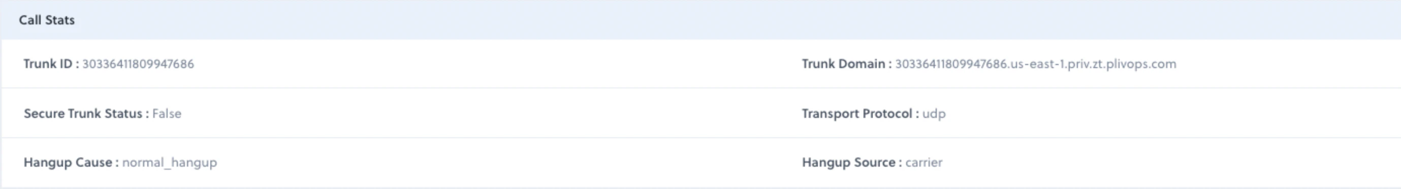 The call stats section contains information about the trunk properties, as well as details regarding call origination and termination.- Trunk ID: A distinctive identifier assigned to the trunk used in the call.