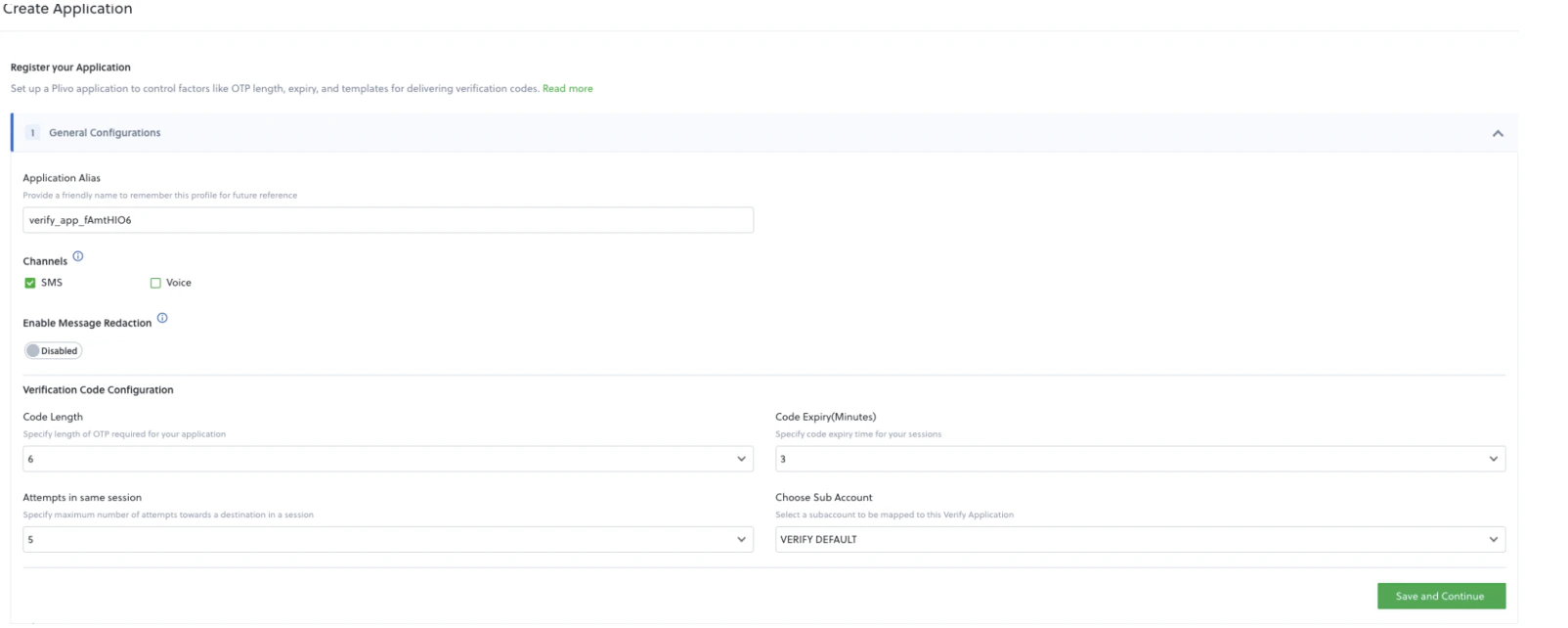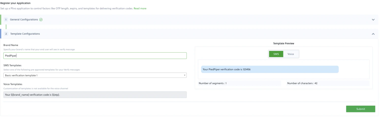 - Default template: Plivo lets you select a template for your application from a list of predefined templates for all types of 2FA use cases. A template might look like “Your ${brand} verification code is ${code}.” When you send a code using an application that uses this template, Plivo will replace the variables “brand” and “code” with the brand specified in the application and a code generated with the type and length specified in the application.