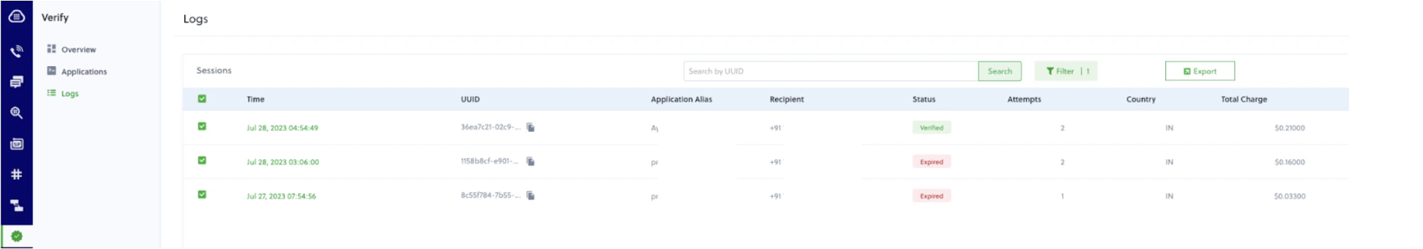 Note: You can view data up to 90 days old on the Logs screen. Plivo doesn’t retain data for longer than 90 days.
