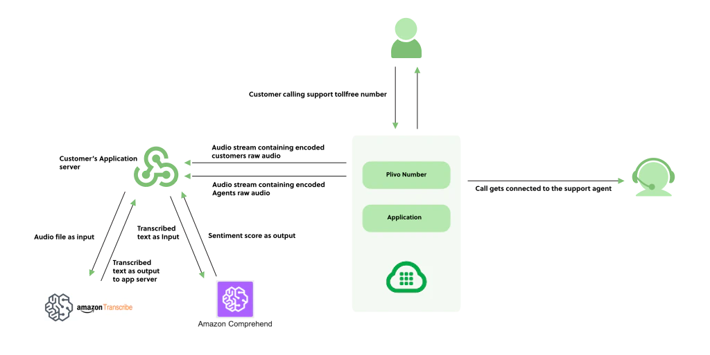 High-quality customer interactions are crucial for maintaining the service standard that gives your business a competitive advantage. Today, Plivo is making it easier than ever to maintain that standard with an application that analyzes call quality using Plivo’s audio stream, paired with various AI-driven transcription and sentiment analysis services. To illustrate, Amazon Transcribe and Amazon Comprehend integrate easily with Plivo’s Voice API. Any AI service for transcription and sentiment analysis could work, but we’ll use these popular products to demonstrate how the API works. If you’re unfamiliar with these two Amazon products, here’s a quick primer:- Amazon Transcribe is an automatic speech recognition service that uses machine learning models to convert audio to text.