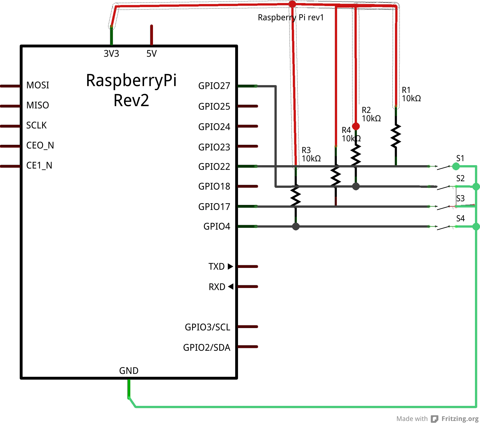 I hooked up a four-button keypad to four of the Raspberry Pi GPIO pins as inputs, then run a continuous loop to check whether the buttons have been pushed. Circuit diagram #1