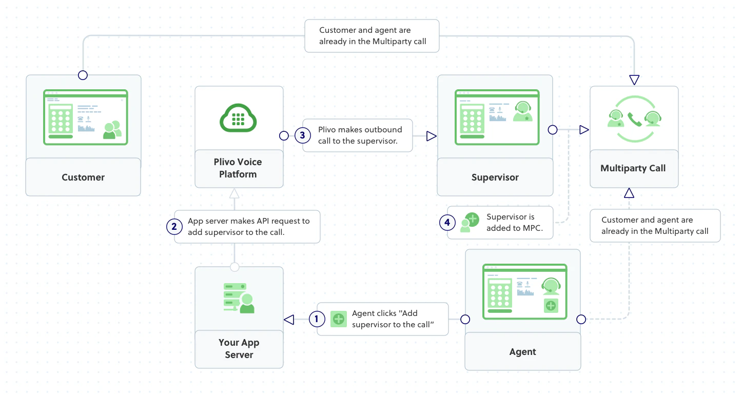 - The supervisor is added to the multiparty call using Plivo’s Add Participant API.