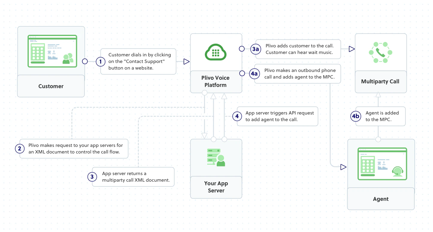Consider the case of a call center where customers call a hotline number to connect with a customer support representative using a web app powered by Plivo Browser SDK. The call flow goes like this:- Customer dials in from the browser app to talk to an agent.