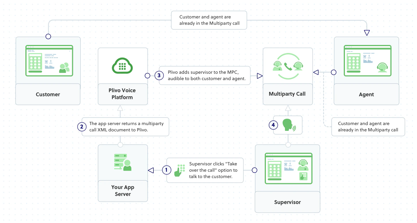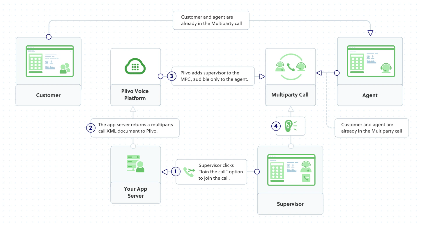 Supervisors in call centers need to coach agents to cultivate an effective team. Coaching involves supervisors listening in on live calls and advising agents without customers’ knowledge. A supervisor can also take over a call and talk to a customer directly. This guide shows how to implement supervisor coaching using Plivo‘s multiparty call (MPC) feature. We’ll look at four tasks:- Connecting a customer and an agent